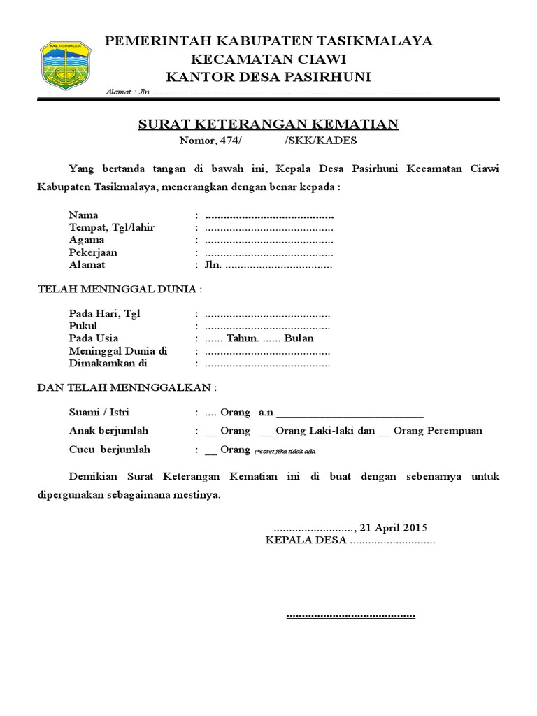 Demikian surat keterangan kematian ini dibuat atas dasar yang sebenarnya. Untuk mengajukan suatu keinginan baik itu beasiswa, penelitian, dan urusan lainnya tentu akan membutuhkan berbagai macam berkas untuk. Surat keterangan kematian biasa digunakan untuk mempermudah atau melengkapi persyaratan tertentu. Demikian surat keterangan kematian ini kami buat sejujur jujurnya diberikan untuk dapat dipergunakan sebagaimana mestinya. Kandungan 1.0 pendahuluan 1 2.0 peranan. Dengan begitu laporan kita akan diproses dan akan dibuatkan surat kematian ini. Dengan mencari langsung contohnya di google mungkin kita bisa mendapatkan format surat keterangan kematian yang kita butuhkan jika kita menggunakan kode di atas. Namun beberapa bank hanya melayani pembuatan rekening untuk masyarakat yang berdomisili di daerah pelayanan bank tersebut. Seperti surat keterangan sakit surat keterangan sakit surat keterangan kelahiran surat keterangan mahasiswa dan lain sebagainya. Ok terima kasih gan, semoga artikel surat keterangan kematian 2 ini bisa membantu kamu, dan gue minto tolong bagiin nih artikel, siapa tau artikel surat keterangan kematian 2 ini bisa. Contoh surat kematian , bila seseorang telah meninggal dunia diharapkan surat keterangan kematian yang dikeluarkan oleh kelurahan setempat atau pejabat setingkat lurah untuk banyak sekali keperluan yang terkait, misalnya saja urusan pengalihan harta warisan, penguasaan sesuatu hal. Surat keterangan kematian adalah sebuah surat yang dikeluarkan oleh kelurahan atau desa untuk menerangkan bahwa seseorang telah meninggal dunia. Contoh surat keterangan usaha untuk pengajuan kredit.